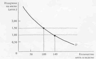 Эта проблема стоит не только перед страховыми компаниями. Моральный риск отражается и на способности рынков эффективно распределять ресурсы. Пусть, например, кривая D на рис.3 показывает спрос на автомобильные перевозки, выраженный в милях в неделю. Кривая спроса убывает, поскольку многие потребители переключаются на альтернативные средства передвижения с ростом цен перевозок автомобилями. Предположим сначала, что издержки перевозок включают стоимость страховки и что страховые компании могут точно измерить, сколько миль проехал водитель. В таком случае моральный риск отсутствует. Водители знают, что страховой взнос на длинные перевозки будет увеличен и, следовательно, вырастут общие издержки перевозок (издержки на милю пути считаются постоянными). К примеру, если издержки перевозок равны 1,50 долл. на милю (из которых 50 центов приходится на страховку), то водитель решает наездить 100 миль в неделю.