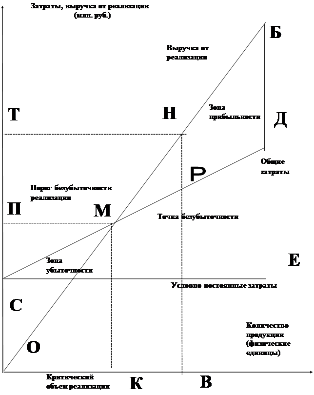 Автор предлагает в качестве механизма контроля и воздействия на субъекты естественных монополий графическое определение условий безубыточности реализации продукции с обеспечением целевой прибыли (см. рис.3). Определив графическим путем точку безубыточности (М), показывающую равенство суммы полученной выручки от реализации продукции и суммы общих затрат (себестоимости), а также границы зон убыточности (ОСМ) и прибыльности (МБД), аналитик имеет возможность сравнительно легко получить ответы на такие сложные вопросы, как: что произойдет, например, с прибылью контролируемого предприятия, если выпуск продукции или выручка от ее реализации уменьшится (увеличится),