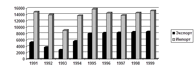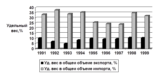 За 1996 год импорт превысил экспорт на 177,3% Причем превышение наблюдается и со странами СНГ (106,6), и с дальним зарубежьем (210,7%). Но в целом за 1996 год наметилась тенденция снижения доли импорта. Эта тенденция сохранилась и в 1997 году, и поэтому возможны положительные сдвиги в развитии отечественного машиностроения. Подтверждает это и показатели доли импорта в объеме продаж на российском рынке некоторых важнейших видов машиностроительной продукции.[4]