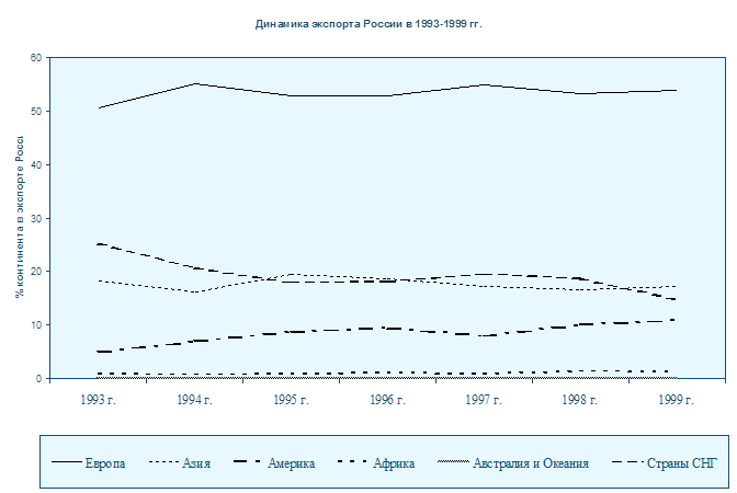 На диаграмме 1 показана динамика изменения экспорта России с 1993 по 1999 гг. Европа исторически является партнёром России. Её доля в экспорте превышает 50%. Наибольшего значения экспорт достиг в 1994 г.(55,2%), превысив уровень 1993 г. на 8,87% (от уровня 1993 г.).