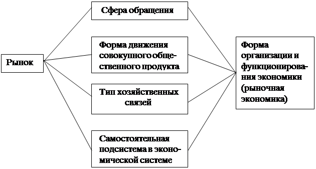 Воспроизводственный аспект характеристики рынка весьма важен. Понятие «рынок» расширяется до понимания его как элемента воспроизводства совокупного общественного продукта, как формы реализации, движения основных составных частей этого продукта. В результате появляется определение рынка как совокупности «экономических отношений, с помощью которых осуществляется обращение общественного продукта в товарно – денежной форме» (Яковец Ю. Революция в экономике. М.,Экономика, 1990). В российской экономической учебной литературе наибольшее распространение получило определение рынка как системы экономических отношений продавцов и покупателей (Машина М.В. Экономическая азбука. М., Международные отношения, 1995; Курс экономики / под ред. Б.А.Райзберга. М.,ИНФРА – М, 1997 и др.).