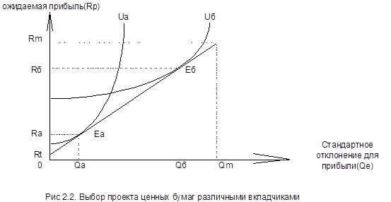 Если инвестор, не желая рисковать, вкладывает все свои сбережения в государственные казначейские векселя, то b = 0 и Rp = Rf (см. рис. 2.1.). Если, наоборот, перед нами отчаянный любитель риска, который вкладывает все свои деньги в покупку ценных бумаг, то b =1, тогда Rp = Rm и при этом резко возрастет риск(см рис.2.1.). В действительности равновесие установится где-то между Rf и Rm(так как часть его средств будет вложена в акции, а часть – в казначейские векселя), например в Re при риске Qe ( в интервале от 0 до Qm)/ Эти точки Re и Qe являются проекцией пересечения кривой безраличия(которая характерна для данного индивида) с бюджетным ограничением в Е. Где именно на бюджетной прямой находится эта точка, зависит от отношения инвестора к риску.