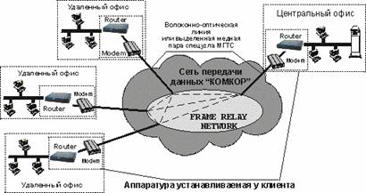 Виртуальные каналы сети пакетной коммутации, построенной на базе сети SDH и вторичной сети выделенных каналов. Эффективный способ соединения географически удаленных локальных вычислительных сетей. Frame Relay совместим со всеми протоколами, наиболее часто используемыми в ЛВС (TCP, Novell IPX, DECNET или NETBIOS). Этот протокол обеспечивает эффективную работу по каналам связи высокого качества. Позволяет эффективно передавать неравномерно распределенный по времени трафик. Обеспечивает малое время задержки при передаче информации через сеть. В отличие от вторичной сети выделенных каналов, для организации нового соединения нет необходимости устанавливать дополнительную аппаратуру. В стоимость услуги также входит установка модема для оптической или медной линии и маршрутизатора с портом 10-BaseT для подключения локальной сети клиента