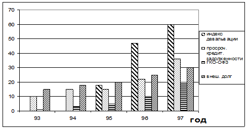 Высокие ставки ГКО-ОФЗ, рост фондового индекса быстрыми темпами (в 8 раз за 96-97 гг.) привели к тому, что инвестиции вытеснялись из реального сектора экономики и направлялись в финансовый сектор, который существовал независимо от производства.»/5/