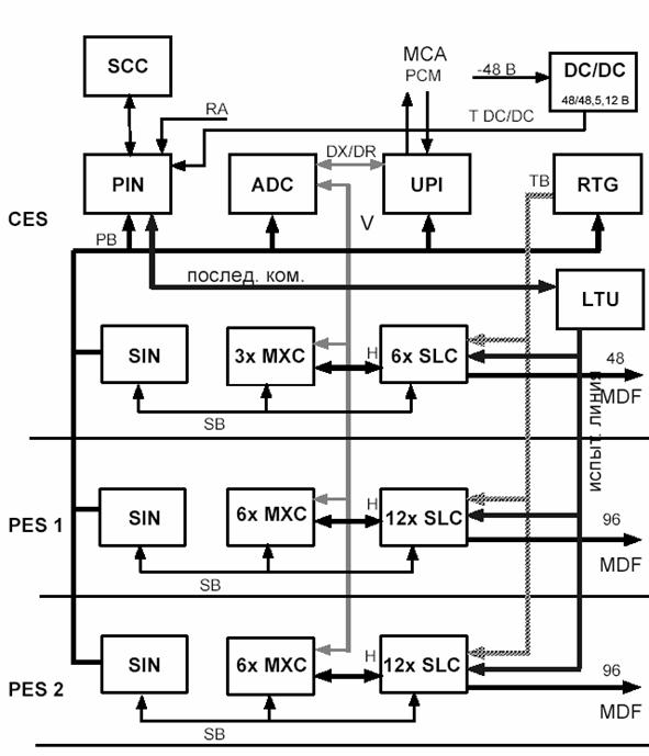 Блок ADC состоит из дифсистемы (преобразование из двухпроводной на четырехпроводную коммутацию), преобразователей A/D и D/A и узла сигнализации (сообщение об аварийном состоянии).