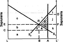 Предположим, что обе страны сняли ограничения на свободное межстрановое передвижение рабочей силы. Поскольку реальная средняя зарплата в двух странах различна, часть работников АВ переместитсяиз страны I в страну П, в результате чего зарплата в обеих странах сбалансируется на уровн ВR. С одной стороны, объем производства с помощью трудовых ресурсов, как оставшихся в стране I, так и мигрировавших в страну П, составит в результате а+Ь+с+d+е+f+h, причем продукт а+Ь+с+d производится трудящимися-гражданами данной страны, а h+е+f.— иностранными трудящимися, иммигрировавшими в страну II. При этом в результате более продуктивного использования трудовых ресурсов за счет их частичного перелива в страну П совокупный продукт, произведенный с помощью того же объема труда, оказывается больше, чем изначальный, на величину сегмента h. Доход трудящихся возрастает до а+Ь+d+е+f+h, тогда, как доходность остальных факторов производства сокращается до сегмента с.