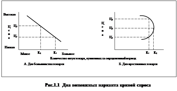 Большинство кривых спроса стремится вниз по прямой или изогнутой линии, как показано на рисунке 7а. Однако в случаях с престижными товарами кривая спроса иногда имеет положительный наклон типа представленного на рисунке 7б. Парфюмерная фирма обнаружила, что, повысив цену с Ц1 до Ц2, она продала духов не меньше, а больше. Потребители посчитали более высокую цену показателем более высокого качества или большей желательности этих духов. Однако при слишком высокой цене (Ц3) уровень спроса оказывается ниже, чем при цене Ц2. Спрос, вероятнее всего, будет менее эластичным при следующих обстоятельствах: