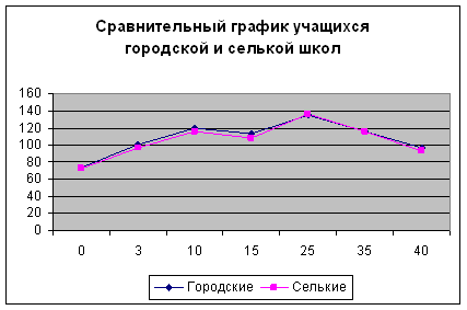 Анализируя данный график, можно отметить, что физиологическая кривая учащихся ЫКСШ №1 более плавная, чем физиологическая кривая учащихся СШ №14 г. Якутска, что свидетельствует о том, что сельские дети более адаптированы к физическим нагрузкам. То есть в процессе занятий физической культурой пульс у сельских детей более или менее равномерный и резкие скачки, как таковые, отсутствуют. На физиологической кривой городских детей же имеет место резкие перепады в пульсе со 100 ударов в начале занятия до 119 ударов в первой четверти, затем спад до 113 ударов на 15 минуте. (т.е. за 5 минут пульс снизился на 6 ударов) Далее, через 10 минут (через 25минут после начала занятия) пульс подскочил до 135 ударов, далее идет равномерный спад, но концу занятия вновь резкий спад – за 5 минут – до 21 удара в минуту.