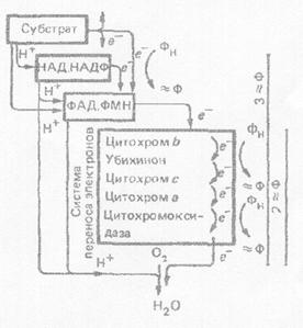 Рис. 3. Схема электронного каскада в нормальном окислительном цикле трикарбоновых кислот (цикл Кребса).