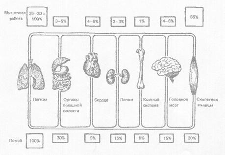 Рис. 4 Распределение кровотока при мышечной работе и в условиях относительного покоя: