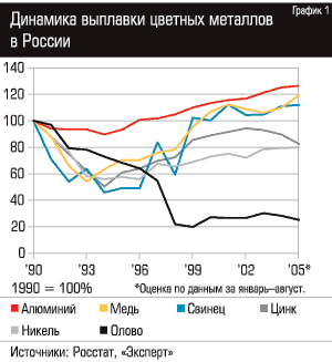 Советский Союз обладал развитой цветной металлургией и был ведущей державой по выплавке большинства металлов. Для лидерства существовали все предпосылки: обширные сырьевые ресурсы и колоссальный внутренний спрос, который поддерживался слишком низкими ценами и порой неоправданно расточительным использованием цветных металлов. После распада СССР народное хозяйство перестало получать металлы по бросовым ценам, их внутреннее потребление многократно сократилось. Однако спад в цветной металлургии был куда менее значительным, чем в других отраслях, отечественные производители смогли быстро переориентироваться на экспорт.