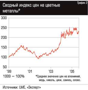 С 1994 года производство цветных металлов у нас в стране начало стабильно увеличиваться. В последние три года мировое потребление, а вслед за ним и цены на металл начали форсированно расти (см. График 2). Последние два года большинство предприятий цветной металлургии омывал золотой дождь, практически все они смогли накопить немалые финансовые резервы для серьезного рывка вперед. Но, несмотря на благоприятную конъюнктуру, темпы прироста производства в 2004 году замедлились, а по итогам первого полугодия 2005-го выплавка ряда металлов впервые за долгие годы сократилась или перестала расти (см. График 1). Отчасти из-за ухудшения инвестиционного климата, отчасти из-за загрузки советских мощностей "под завязку". По сути дела, экстенсивный восстановительный рост в отрасли завершен.