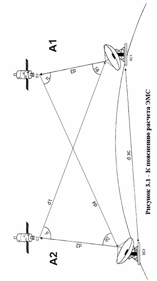 На рисунке 3.1 приведены все расстояния и углы, определенные в расчете. Система А1, связанная со спутником С1 и земной станции ЗС1 является мешающей для системы А2, состоящей из спутника С2 и земной станции ЗС2.
