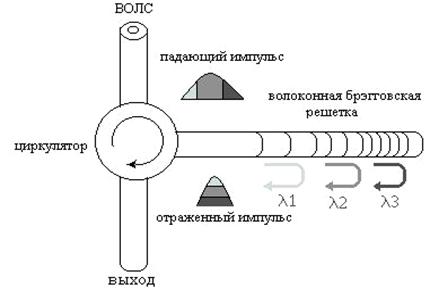 Компенсаторы на основе брэгговских решеток с переменным периодом привлекают в последнее время большое внимание исследователей своими большими потенциальными возможностями. Волоконная брэгговская решетка FBG (fiber Bragg grating) - оптический элемент, основанный на периодическом изменении показателя преломления сердцевины или оболочки оптического волокна. Принцип работы компенсаторов на основе брэгговских решеток с переменным периодом поясняет рис. 4.3. Он основан на том, что компоненты с различной длиной волны отражаются от различных участков решетки и, таким образом, проходят различный путь. Решетки записываются (прочерчиваются) в волокне с использованием фоточувствительности определенных типов оптических волокон. Обычное кремниевое волокно при добавлении примеси германия становится чрезвычайно фоточувствительным. Подвергая это волокно воздействию ультрафиолетового света, можно вызвать изменения показателя преломления в сердцевине волокна. В таком волокне решетка может быть создана с помощью облучения волокна двумя интерферирующими ультрафиолетовыми пучками. Это заставляет интенсивность излучения изменяться периодически по длине волокна. Там, где интенсивность высокая, показатель преломления увеличивается, а где она мала, показатель остается без изменений [4].