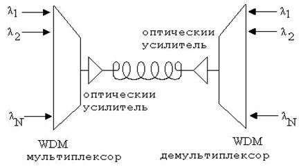 Рис. 1.1. Простейшая структурная схема системы передачи WDM.