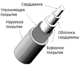 Оптическое волокно (рис. 2.1) состоит изсердцевины, по которой происходит распространение световых волн, и оболочки, предназначенной, с одной стороны, для создания лучших условийотражения на границе раздела «сердцевина - оболочка», а с другой - для снижения излучения энергии в окружающее пространство. С целью повышения прочности и тем самым надежности волокнаповерх оболочки, как правило, накладываютсязащитные упрочняющие покрытия.