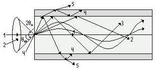 (лучи 4), носят название вытекающих лучей (лучейоболочки). Достигая границы «сердцевина - оболочка», эти лучи отражаются и преломляются, теряя каждый раз в оболочке волокна часть энергии, в связи с чем исчезают вовсе на некотором расстоянии от торца волокна. Лучи, которые излучаются из оболочки в окружающее пространство (лучи 5), носят название излучаемых лучей и возникают в местах нерегулярностей или из-за скручивания ОВ. Излучаемые и вытекающие лучи являются паразитными и приводят к рассеиванию энергии и искажению информационного сигнала.