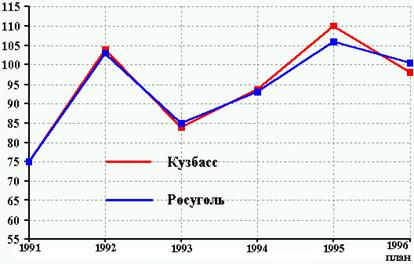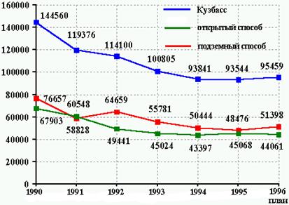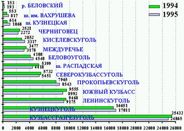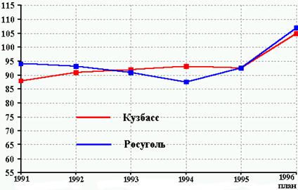 В 1995 году на шахтах и разрезах Кузбасса добыто 93,5 млн.тонн угля. К 1994 году уровень добычи снижен на 297 тыс.тонн (0,3%).