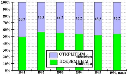 Соотношение подземного и открытого способов добычи по Кузнецкому бассейну
