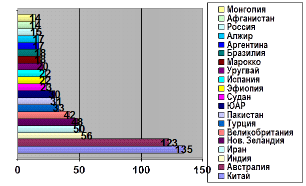 Индия Китай Кения Шри-Ланка Индонезия Турция Япония Иран Бангладеш Аргентина | 800 650 280 270 150 120 90 60 55 50 |