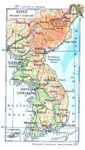 Корейский полуостров замыкает северо-восточную оконечность Азиатского континента, протянувшись с севера на юг примерно на 800 км, а с запада на восток – от 132 до 360 км. На севере Республика Корея отделена от КНДР военно-демаркационной линией, проходящей примерно по 38” с.ш. Самая южная точка полуострова лежит на 33”07’ с.ш.