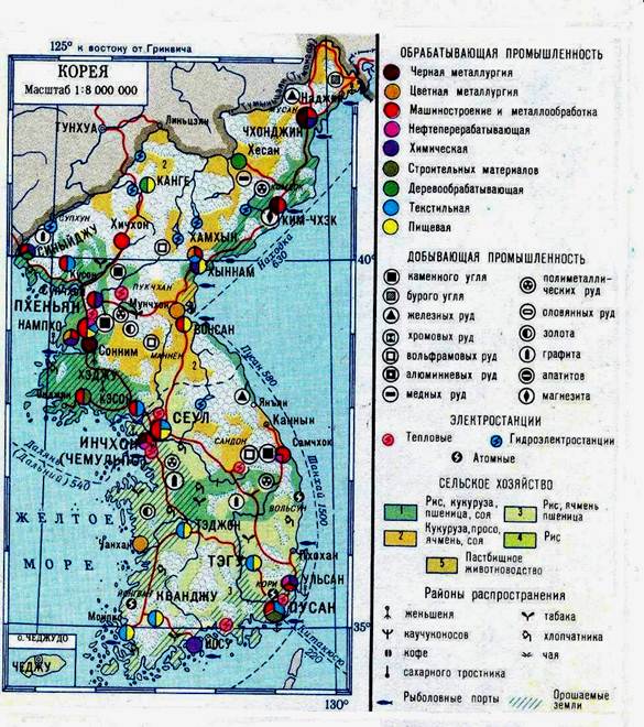Республика Корея довольно бедна полезными ископаемыми, а поэтому практически полностью зависит от ввоза минерального сырья из-за рубежа. Промышленное значение имеют запасы угля – антрацитов и лигнитов – в бассейнах Самчхок – Чонсон (провинция Канвондо) и в провинции Чхунчхондо: на эти районы приходится ¾ запасов, общий объем которых оценивается в 1,7 млд т. Качество угля довольно низко, лишь 3,5% добываемого топлива имеют теплотворную способность свыше 5200 ккал/кг.