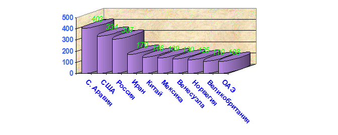 Диаграммы №1 и №3 также отражают снижение добычи нефти по годам и показывают 3-е место России в мировой добыче нефти после Саудовской Аравии и США в 1995 году.