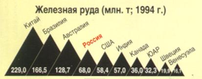 Диаграмма №5 показывает четвертое место России в 1994 году по добыче железной руды после Китая, Бразилии и Австралии.