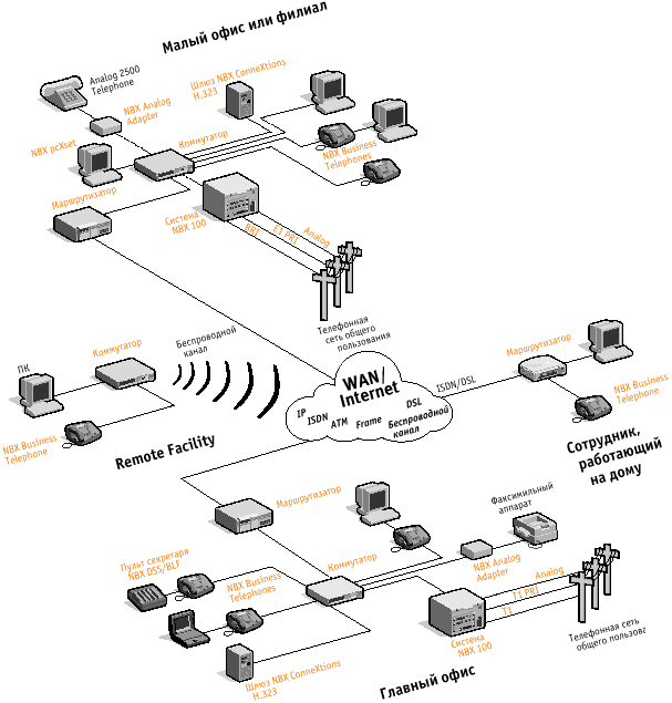 Система 3Com NBX 100 Communications System позволяет организациям, имеющим дополнительные офисы, пользоваться недорогими высококачественными услугами Voice-over-IP, используя приложение-шлюз 3Com NBX ConneXtions H.323. Это позволяет отказаться от дорогостоящих соединительных линий между офисами и перенести телефонные соединения в пределах компании в магистральную сеть передачи данных, получив тем самым дополнительную отдачу от средств, вложенных в создание распределенной сети передачи данных. Благодаря системе NBX 100 компания может перейти во всех офисах на одну стандартную платформу бизнес-телефонии независимо от технологии, используемой в каналах WAN - будь то ISDN, ATM, T1/E1, Frame Relay, xDSL, кабельные модемы или беспроводная технология Ethernet. Система NBX 100 также поддерживает протокол IGMP (IP multicasting), что позволяет обеспечить голосовую связь высокого качества при подключении домашних офисов или филиалов через загруженную локальную или территотиально-распределенную сеть.