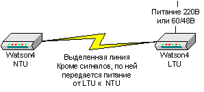 Модемы Watson4 имеют несколько вариантов электропитания: по переменному току (220В) и по постоянному току (60В или 48В). Последний вариант часто используется в крупных узлах связи. Кроме того, в линейке модемов Watson4 существует две модификации модемов – LTU и NTU. Отличаются они тем, что первый может подавать питание в линию, а второй может получать питание с линии. Естественно, для того, чтобы блок NTU мог получать питание с линии, на другом конце выделенной линии должен быть установлен модуль LTU (см. рис 1).