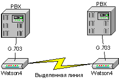 Для связи между собой двух УАТС (PBX - Private Branch Exchange), как правило, используются интерфейс G.703 с кадрами G.704 (поток Е1). В этом случае для организации такой связи могут быть выбраны модемы Watson4 с интерфейсом G.703 на коаксиальный кабель или витую пару. Схема соединений приведена на рис 3.