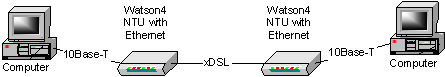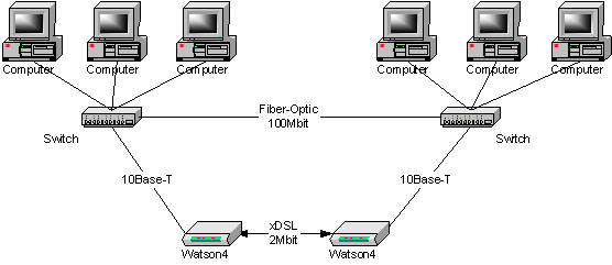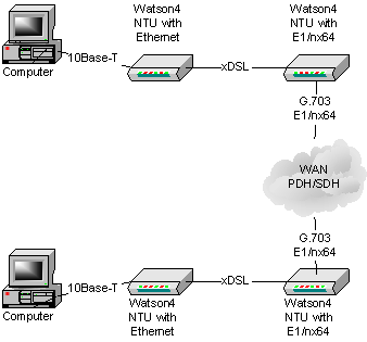 Модемы Watson4 позволяют организовать соединение между двумя локальными сетями. Такое решение применимо в том случае, если расстояние между сетями велико и нет возможности организовать выделенную линию между ними – например, сети расположены в разных городах. В этом случае используются 4 устройства серии Watson4: два - с портами Ethernet и два - с портами, например, G.703. Схема соединений приведена на рис 3.