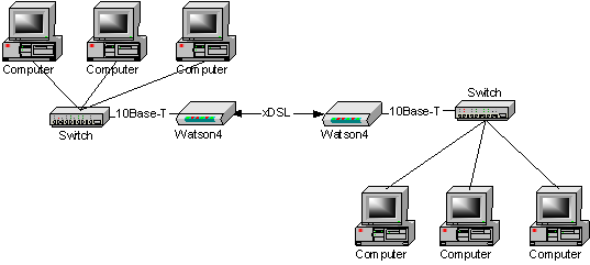Модемы серии Watson4 позволяют организовать высокоэффективное соединение между двумя локальными сетями. Для этих целей существует модель со встроенным мостом (bridge). Мост производит анализ MAC-адресов фреймов Ethernet и если определяет, что адрес назначения принадлежит локальному сегменту, то не передает фрейм через медленный канал.