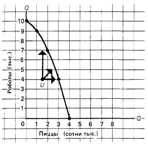 Графически ситуация незанятости или неполной занятости ресурсов может быть представлена точкой внутри первоначальной кривой производственных возможностей, воспроизведенной на рисунке 2. Такой точкой является точка U. Здесь мы обнаруживаем, что экономика отстает от различных максимальных комбинаций производства пиццы и роботов, представленных всеми точками на кривой производственных возможностей. Стрелки на рисунке 2 указывают на три возможных пути возврата к полной занятости ресурсов и полному объему производства. При этом продвижение к полной занятости ресурсов и полному объему производства влечет за собой увеличение производства одного или обоих продуктов.