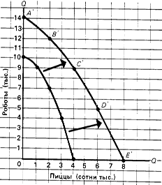 Что происходит с кривой производственных возможностей на рисунке 2, когда имеет место увеличение предложения ресурсов или совершенствование техники и технологии? Кривая смещается вовне и вправо, как свидетельствует кривая А -Е на рисунке 3. Экономический рост — способность производить больший общий объем продукции — выражается о смещении кривой производственных возможностей вправо; он представляет собой результат увеличения предложения ресурсов и технического прогресса. Следствием экономического роста является то, что наша экономика при полной занятости ресурсов может обеспечить больший объем производства и пиццы и роботов. В то время как статичная, нерастущая, экономика вынуждена жертвовать частью X, чтобы получить больше Y, динамичная, растущая, экономика способна располагать большим количеством и Х и Y.