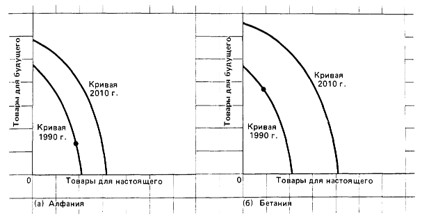 Предположим теперь, что существуют две экономики, Алфания и Бетания, которые в данный момент во всех отношениях идентичны, за исключением того, что в настоящее время (1990 г.) Алфания на ее кривой производственных возможностей отдает предпочтение не "товарам будущего", а "текущим товарам". Точка на рисунке 4(а) отражает эту альтернативу. В свою очередь, Бетания в настоящее время (1990 г.) отдает предпочтение выпуску большего объема "товаров будущего" за счет уменьшения объема "товаров для настоящего" (рисунок 4(6). Следовательно, при неизменности всех прочих позиций можно предвидеть, что будущая (2010 г.) кривая производственных возможностей Бетании окажется значительно более смещенной вправо, чем кривая Алфании. Иначе говоря, избрав сегодня структуру производства, которая более благоприятствует технологическому прогрессу, увеличению количества и повышению качества материальных и людских ресурсов, Бетания сумеет обеспечить больший экономический рост, чем Алфания, чей сегодняшний выбор структуры производства менее сориентирован на те товары и услуги, которые способствуют смещению кривой производственных возможностей вправо. Руководствуясь исключительно идеей примата средств производства, Бетания предпочитает делать больше пристроек к своей "национальной фабрике", то есть инвестировать большую долю своей текущей продукции, чем Алфания. Такой выбор обеспечивает Бетании компенсацию, или выгоду, в форме более быстрого экономического роста — в виде большей производственной мощности в будущем. Разумеется, это достигается ценой меньшего объема потребительских благ для текущих нужд.