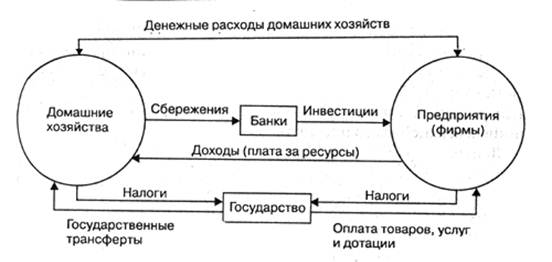 На рис.2 показано, что государство собирает налоги с населения (домашних хозяйств) и предприятий, формируя тем самым доходную часть государственного бюджета. Расходные статьи государственного бюджета включают покупку товаров и услуг (для нужд обороны и строительства дорог, поддержки государственных предприятий и содержания учреждений), выплаты домашним хозяйствам социальных трансфертов, т.е. безвозмездные выплаты ] субсидий, пособий, пенсий, стипендий.