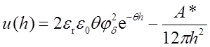 A* – константа Гамакера, h – расстояние между поверхностями пластин, er – относительная диэлектрическая проницаемость среды между пластинами, e0 – электрическая постоянная (диэлектрическая проницаемость вакуума), p – число пи, jd – потенциал на границе диффузной части и плотной части двойного электрического слоя, величина θ (параметр Дебая) равна обратной величине толщины диффузного слоя d: