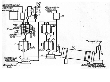 Ðèñ.1. Ñõåìà óñòàíîâêè ïåðèîäè÷åñêîãî äåéñòâèÿ äëÿ ïîëó÷åíèÿ àäèïèíîâîé êèñëîòû îêèñëåíèåì öèêëîãåêñàíîëà àçîòíîé êèñëîòîé: 1-íàïîðíûé ìåðíèê àçîòíîé êèñëîòû; 2 – íàïîðíûé ìåðíèê öèêëîãåêñàíîëà; 3 – êàïëåîòáîéíèê; 4 – õîëîäèëüíèê; 5 – ñåïàðàòîð; 6 - ðåàêòîð îêèñëåíèÿ öèêëîãåêñàíîëà àçîòíîé êèñëîòîé; 7,10- êðèñòàëëèçàòîðû, 8,11 – íóò÷-ôèëüòðû; 9 – ðàñòâîðèòåëü; 12 – ìåðíèê äåìèíåðàëèçîâàííîé âîäû; 13 – ñóøèëüíûé áàðàáàí; 14 – öèêëîí.