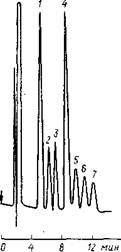 Рис. 3. Хроматограмма моносахаридов, полученная на колонке размером 250x4,6 мм с полигосилом 60 NH2 (5 мкм), подвижная фаза —ацетонитрил — вода (75:25 по объему), расход 2 мл/мин, детектор — УФ (190 нм): 1 — рамноза; 2 — ксилоза; 3 — арабиноза; 4 — фруктоза; 5 — манноза; 6 — глюкоза; 7 — галактоза