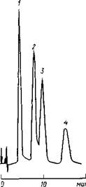 Рис. 4. Хроматограмма цитохромов Ц разного происхождения, получен-ная на колонке размером 250х4 мм с нуклеосилом CN (5 мкм), подвижная фаза — 0,05 М раствор сульфата натрия в 0,1 М фосфатном буферном растворе (рН 2,0) — ацетонитрил (77,5:22,5 по объему), расход 1 мл/мин, детектор — УФ (400 нм): 1 — лошади; 2 — быка; 3 — собаки; 4 — тунца