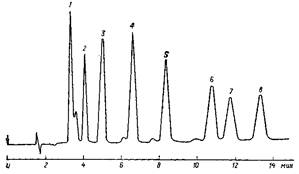 Рис. 7. Хроматограмма смеси ароматических углеводородов, полученная на колонке размером 250х4,6 мм с зорбаксом ОДС (6 мкм), подвижная фаза — метанол — вода (90:10 по объему), расход 1,5 мл/мин, детектор УФ (254 нм), проба 20 мкл: 1 — толуол; 2 — о-ксилол; 3 — трет-бутилбензол; 4 — n-трет-бутилтолуол; 5 — n-трет-амил-толуол; 6 — n-трет-гексилтолуол; 7 — 3,5-ди-трет -бутилтолуол; 8 — трет-гексил-о-ксилол