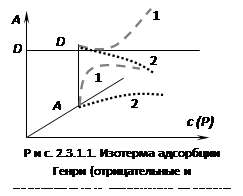 Эти уравнения представляют собой уравнения изотермы адсорбции при малых концентрациях. В соответствии с этими уравнениями можно по другому сформулировать закон Генри: величина адсорбции при малых давлениях газа (малых концентрациях вещества в растворе) прямо пропорциональна давлению (концентрации). Эти зависимости показаны на рисунке 2.3.1.1. При адсорбции на твердых телах область действия закона мала из-за неоднородности поверхности, но даже на однородной поверхности при увеличении концентрации обнаруживается отклонение от закона. При малых концентрациях распределенного вещества отклонения обусловлены в основном соотношением между взаимодействием молекул друг с другом и с поверхностью адсорбента. Если когезионные взаимодействия адсорбата больше, то отклонение от закона отрицательно и <1, и коэффициент распределения увеличивается (кривая 1 на рис. 2.3.1.1). Если сильнее взаимодействие "адсорбат – адсорбент", то отклонение положительно и D уменьшается (кривая 2 на рис. 2.3.1.1). При дальнейшем увеличении концентрации происходит уменьшение свободной поверхности, снижается реакционная способность и кривые загибаются к оси абсцисс. Константу Генри получают экстраполяцией коэффициента распределения на нулевую концентрацию. В соответствии с правилом фаз Гиббса в гетерогенных системах равновесные параметры зависят от дисперсности или удельной поверхности. Для адсорбционных систем эта зависимость выражается в уменьшенных концентрациях вещества в объемной фазе с увеличением удельной поверхности адсорбента. Если в такой системе содержание распределяемого вещества постоянно, то