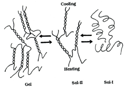 При высокой температуре макромолекулы геллана существуют в виде расплетенных единичных клубков (золь-I). При охлаждении цепи геллана ассоциируются с образованием двойной спирали и упорядоченной структуры. Однако такая упорядоченная структура еще не приводит к образованию сетки (золь-II). Гелеобразование имеет место только в присутствии катионов. Это связано с тем, что температура фазового золь-гель перехода становится ниже температуры конформационного перехода спираль-клубок. Однако для геллана, который проявляет два отдельных перехода (золь-I, золь-II и гель) не характерен термический гистерезис при охлаждении и нагревании . Разница между температурой перехода спираль-клубок и золь-гель уменьшается с увеличением концентрации добавленной соли. Водный раствор геллана переходит в гель при температуре 30-35°С [22], который плавится при 90 °С.