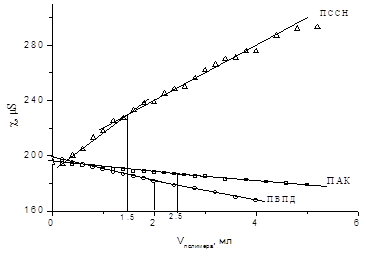 При этом состав образующихся полимер-полимерных комплексов определен кондуктометрическим титрованием одного полимера другим.