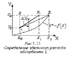 Ординату У* некоторой точки О' на кривой равновесия, соответствующую составу жидкости X, можно найти, если известна температура t при данном составе жидкости.Для этого необходимо составить уравнение теплового баланса для части адсорбционного аппарата, расположенной выше некоторого произвольного сечения с концентрациями X и У жидкости и газа соответственно: