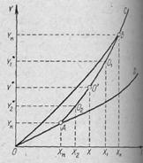 Задаваясь рядом произвольных значений X в интервале между известными величинами Хн и Хк, с помощью уравнения (XI, 19) вычисляют t. По опытным данным находят соответствующие значения У* и строят линию равновесия (по точкам О1, 02.