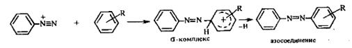 Установлено, что реакция азосочетания протекает по механизму электрофильного замещения, в котором атакующим агентом выступает ион диазония (Аг—N=N),а субстратом — ароматические системы, содержащие в п- или о-положении заместители NH2, NHAlk, NHAr, N(Alk)2, NHSO3H, NHNO2, ОН и в некоторых случаях OAlk: