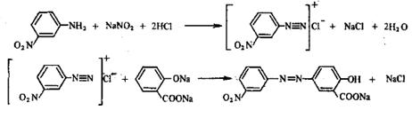 В стакане растворили 2,5 м-нитроанилина в разбавленной соляной кислоте (8,5 мл концентрированной НС1 в 40 мл воды). Для полного растворения содержимое слегка нагревали. Охладив полученную смесь до 0°С, ее диазотировали, добавляя по каплям из капельной воронки раствор 1,5 г нитрита натрия в 5 мл воды. Следили за тем, чтобы температура не поднималась выше 5°С. Диазораствор при хорошем размешивании приливали к находящемуся в фарфоровом стакане при 0°С раствору 2,5 г салициловой кислоты и 7,5 г карбоната натрия в 40 мл воды. Жёлтый осадок красителя отфильтровали, слегка промыли 10%-ным раствором хлорида натрия и сушили при 40-50°С.