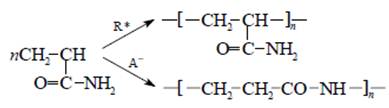 Знаками R* и A- соответственно обозначены радикал и анион. Радикальная полимеризация - основной промышленный метод получения водорастворимого ПАА. При анионной полимеризации образуется поли-β-аланин (найлон-3), нерастворимый в воде полимер, растворяющийся только в некоторых органических растворителях при нагреве.